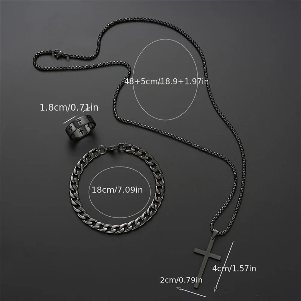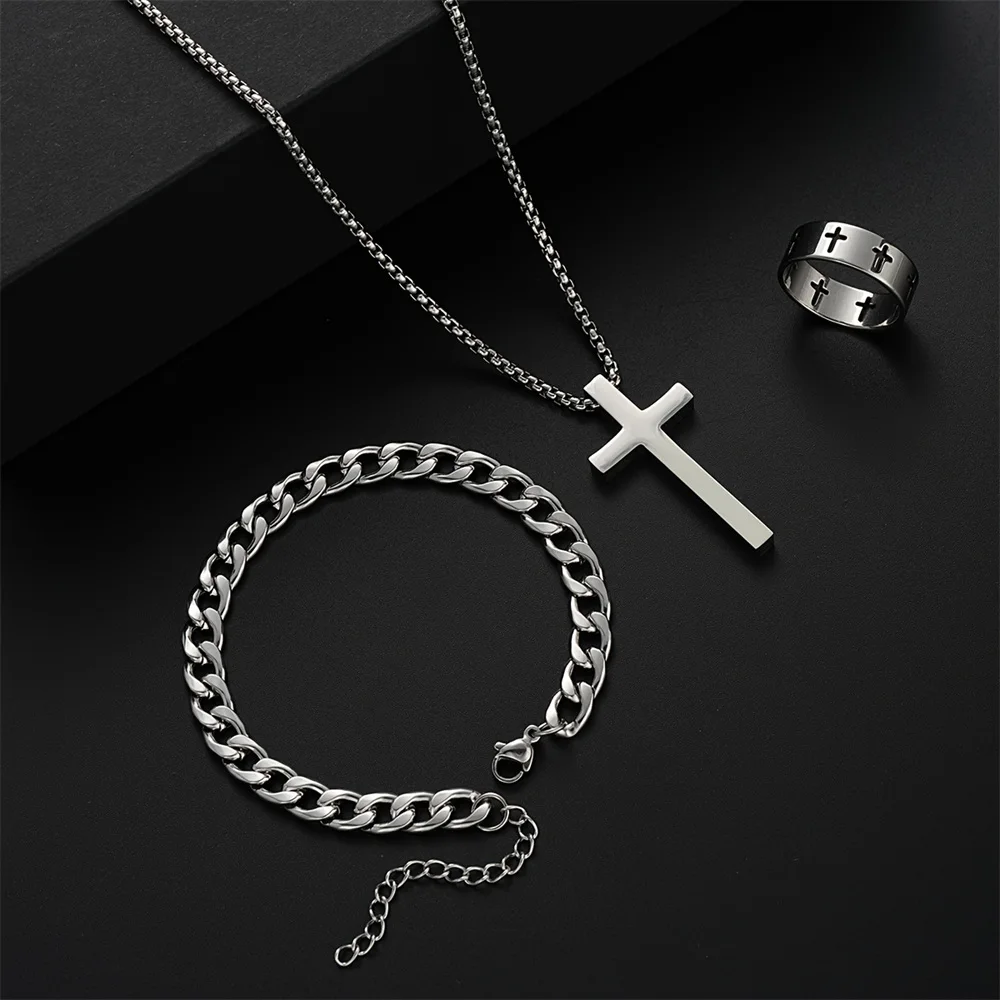 3pcs Set Men’s Stainless Steel Metal Cross Pendant Chain Necklace Bracelet Ring Jewelry Set Male Hip Hop Daily Wear Accessories